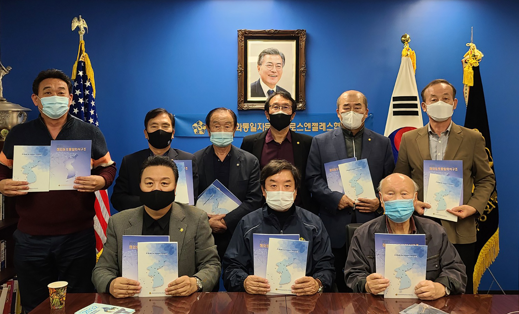민주평화통일자문회의 LA협의회(회장 에드워드 구)는 지난 6일 LA한인타운 사무국에서 2020년 활동자료집 ‘평화로의 동행(A Walk to Korean Peace)’과 해외동포 설문조사 보고서인 ‘2020 해외동포 통일의식 구조’ 출판 기념회를 열었다. 평화로의 동행은 LA평통이 지난 1년 동안 한반도 평화정착 및 통일운동을 알린 공공외교 활동 내용을 담았다. 해외동포 통일의식 구조는 지난해 11월 남가주 한인 403명을 대상으로 진행한 설문조사 결과를 분석했다. 에드워드 구 회장은 “한반도 평화정착과 통일은 소수 전문가에게만 맡길 수 없다. 해외 동포가 생각하는 평화와 통일에 관한 설문조사 결과를 정리해 한국 정부에 정책개발 참고자료로 전달했다”고 말했다. 출판 기념회에 참석한 LA평통 에드워드 구(앞줄 가운데) 회장과 자문위원들이 기념촬영을 하고 있다.