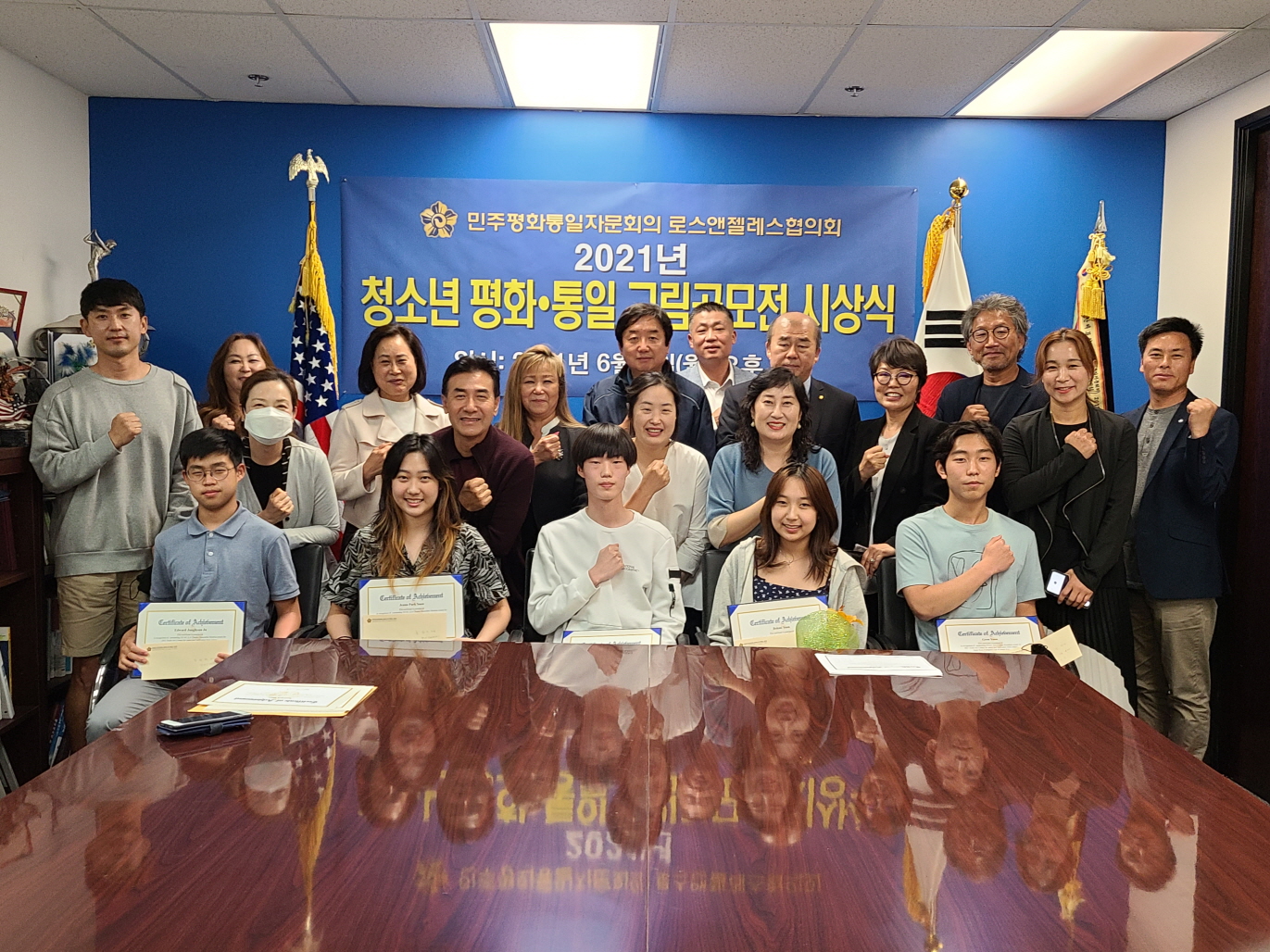 민주평화통일자문회의 LA협의회(회장 에드워드 구)는 지난 9일 사무국에서 ‘2021년 청소년 평화통일 그림공모전 시상식’을 개최했다. 이날 시상식에는 최우수상을 받은 김주현 학생 등 수상자와 가족이 참석했다. 올해 그림공모전은 남북 최고의 순간, 평화와 통일미래, 비무장지대 평화 등을 주제로 열렸다. 자문위원들과 수상자들이 기념촬영을 하고 있다.