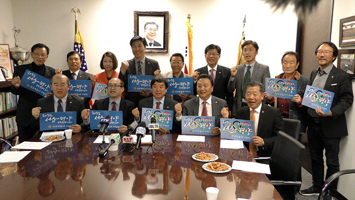 민주평화署일자문회의 LA협으I회(회장에드워드 구,앞줄 오른쪽에서 세번째)가’2032년 올럼픽 서울-평양공동유치 지원단’을 13일 발 족했다. 앞으로 LA협의회 자문위원을 중심으로한인사회 관계자들을대거 영입하고,▲올럼픽 공감포럼,▲국제올림픽위원호ᅵ(ICC)에 편지 보내기,▲소설네트워크와유튜브를 署한 홍보활동등을전개해 나간다는 목표를세뒀다. 평署자문위원들이 서울-평양공동올 리픽 유치 기원 포스터를들어보이고있다.